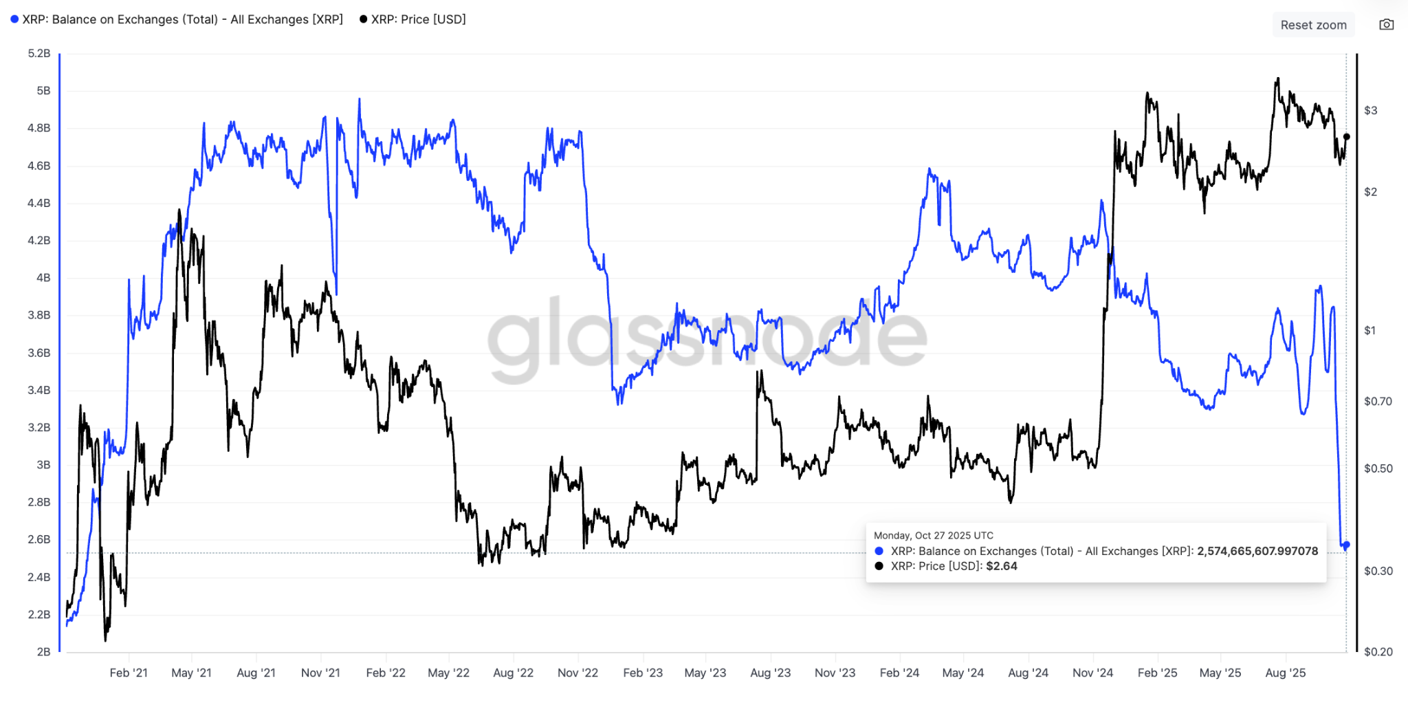 Aşağıdaki grafik, XRP bakiyesinin 20 Eylül'deki 3,9 milyardan Çarşamba günü 1,4 milyar tokenlik düşüşle 2,57 milyara düştüğünü gösteriyor.